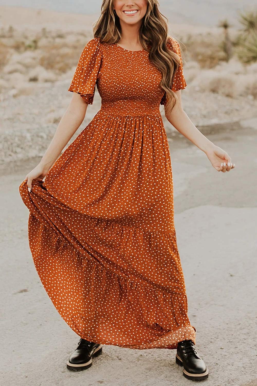 - Style: ?We couldn't love these classic Solid color dresses more. The shape is so flattering and we owe it all to the full elastic bodice. The flutter sleeve, and smocking detail,self-tie/keyhole on back add such a pretty detail on this basic maxi. Plus this makes it extra comfortable. As for the material, it's soft,comfortable friendly to your skin,perfect for Spring,Summer and Fall days!