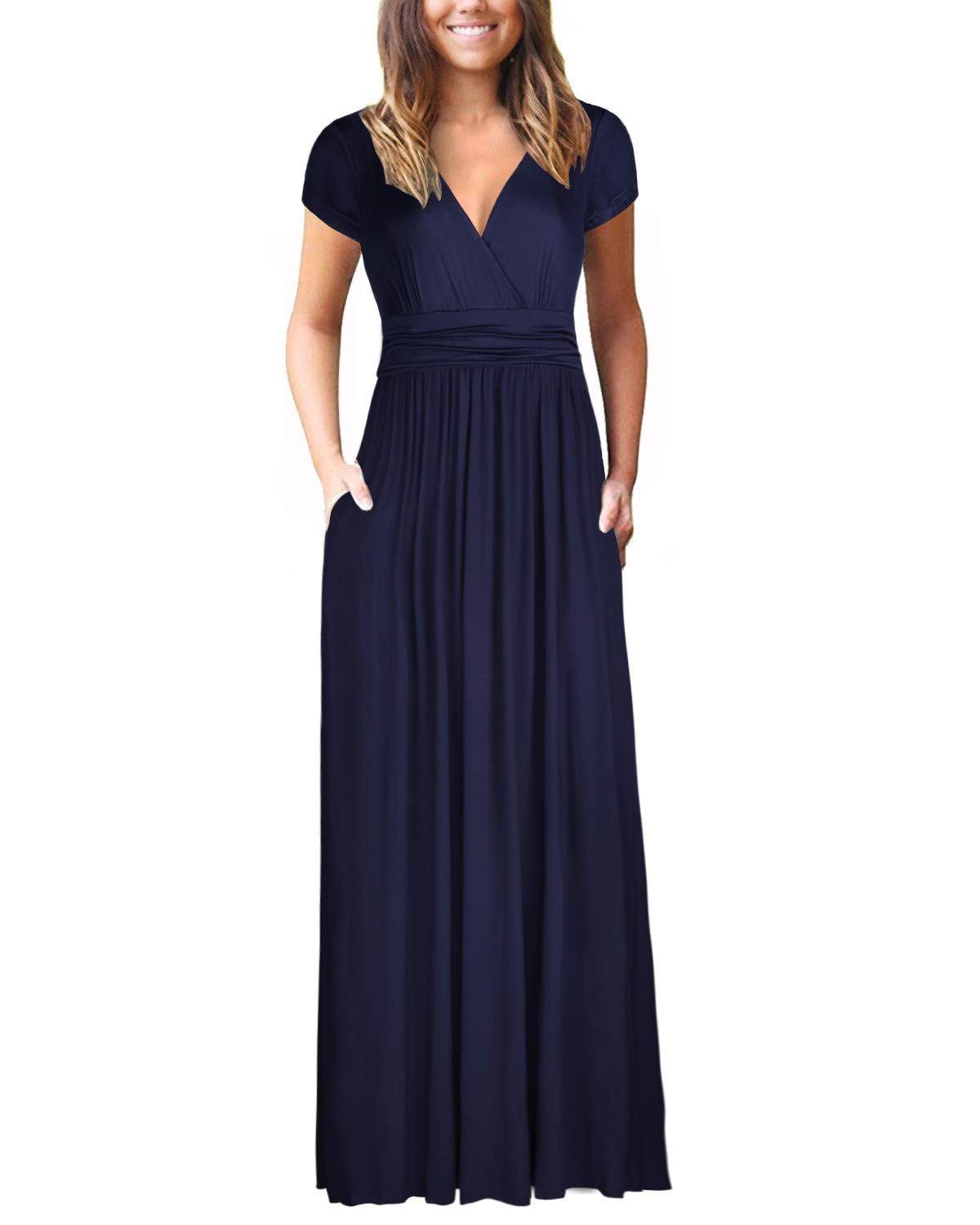 Royal Navy Ladies Summer Casual V Neck Short Long Sleeve Floral Pattern Wrap Ladies Maxi Long Dress with Pockets - OUGES | Women's Evening Gowns