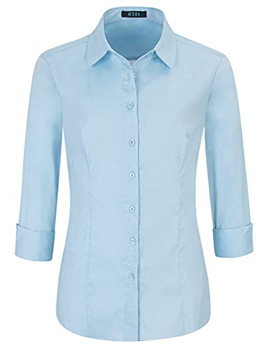 Sky Blue Womens Slim-Fit Long Sleeve Stretchy Button Down Collar Office Formal Casual Shirt Blouse - EZEN