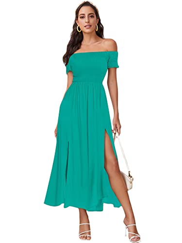 Solid Light Green Women's Boho Floral Print Off Shoulder Split Long A Line Dress - Floerns