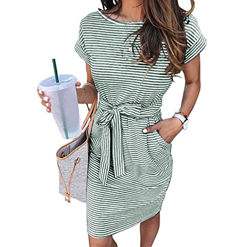 Stripes Green Summer Dresses Round Neck Short Sleeve T Shirt Midi Casual Dress Tie Waist with Pockets - Jaksenr