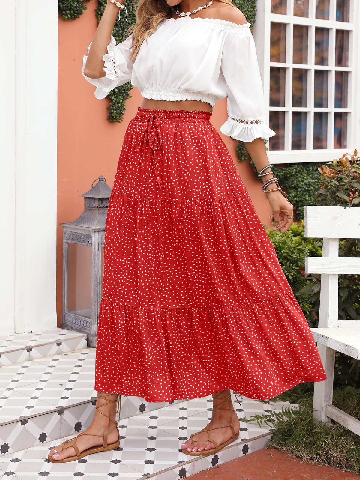 Tomato Women's Bohemian Floral Printed Elastic Waist A Line Maxi Skirt with Pockets - ZESICA