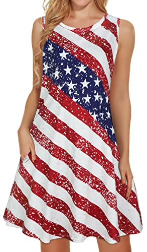 Us Flag Summer Dresses for Women Beach Floral Tshirt Sundress Sleeveless Pockets Casual Loose Tank Dress - elescat
