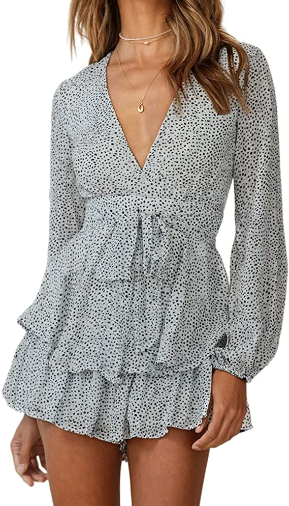 White Dot Women's Jumpsuit Floral Print V Neck Baggy Sleeve Waist Tie Double Layer Ruffle Hem Short Mini Dress Romper - Relipop