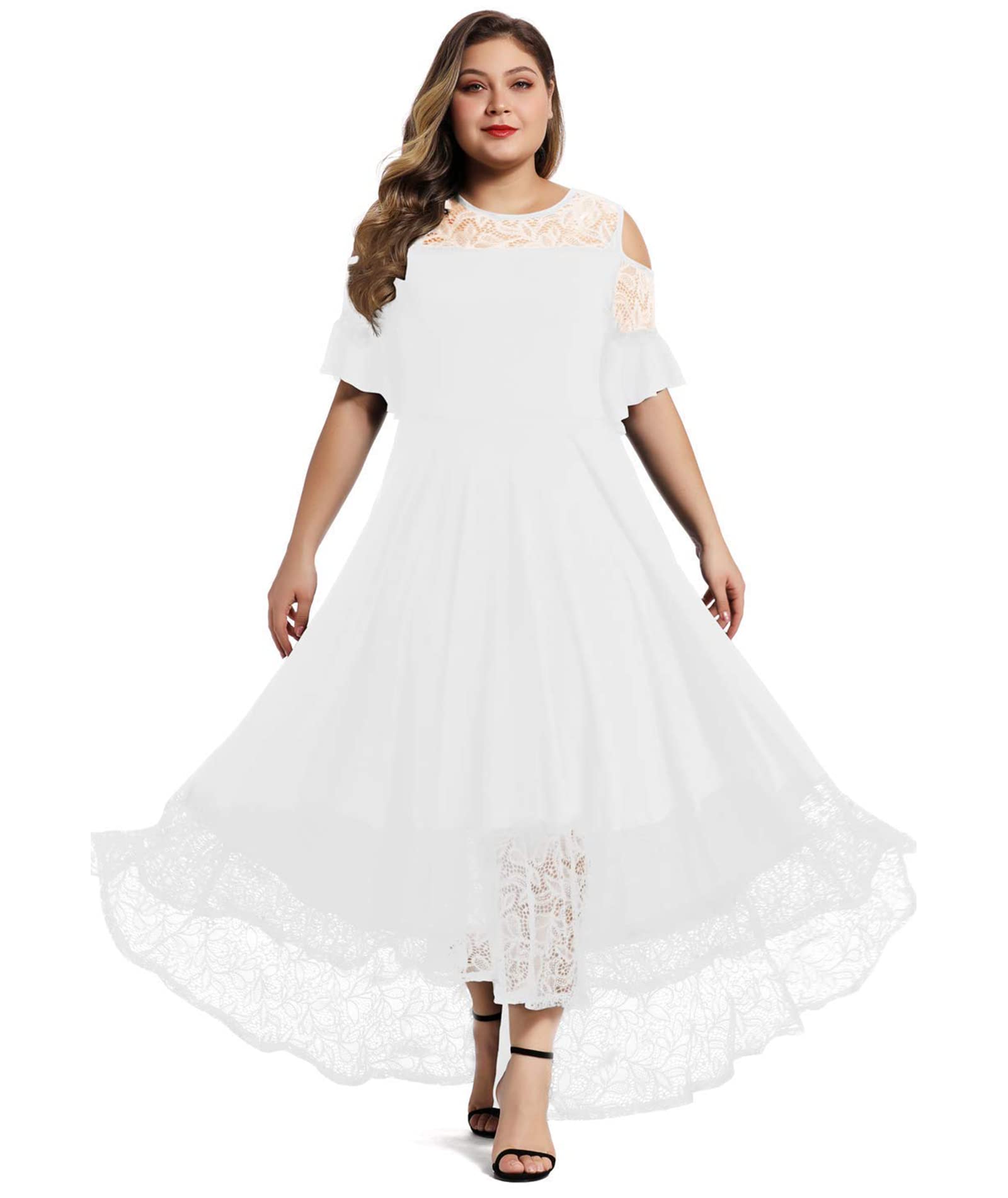 White Womens Plus Size Lace Cold Shoulder Long Swing Evening Party Maxi Dress - LALAGEN
