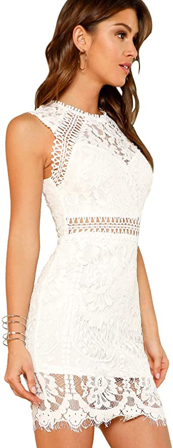 White Women's Sleeveless Scalloped Hem Fitted Floral Lace Bodycon Dress - Verdusa