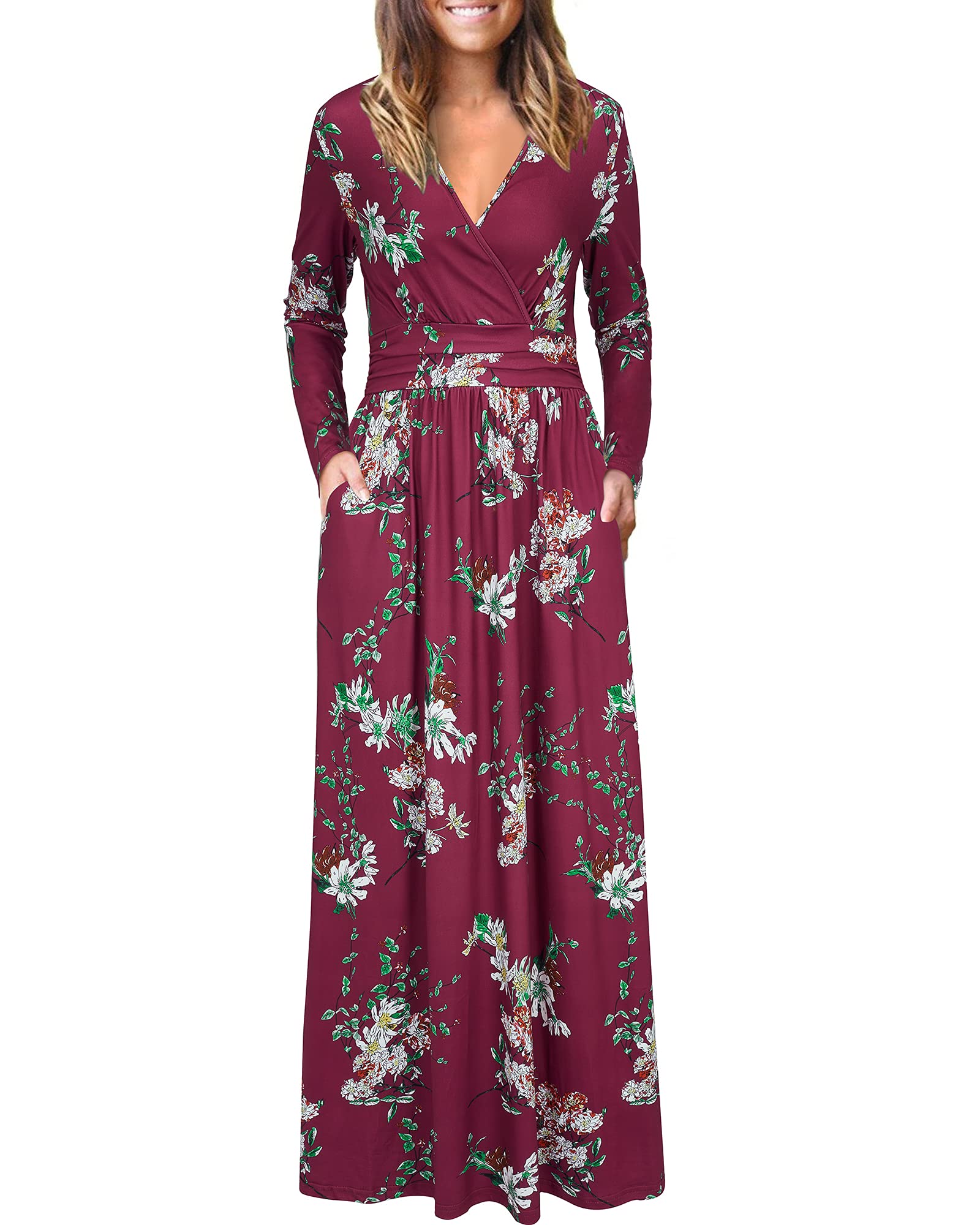 Home Wine Red Floral Ladies Summer Casual V Neck Short Long Sleeve Floral Pattern Wrap Ladies Maxi Long Dress with Pockets - OUGES