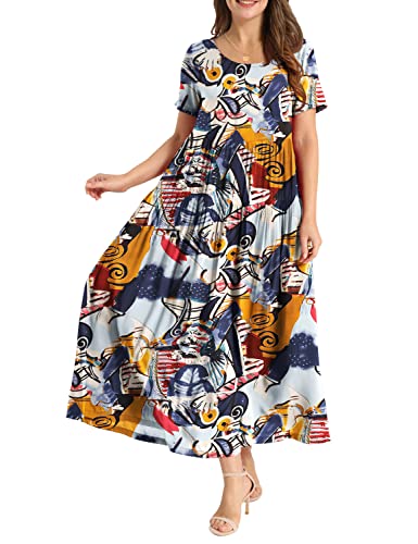 Wite Multi Dresses Casual Plus Size Bohemian Short Sleeve Floral Long Maxi Summer Beach Swing Dress/Pockets - YESNO