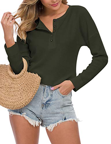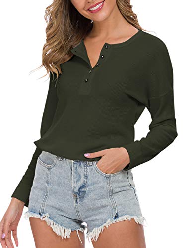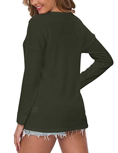 WNEEDU Women's Long Sleeve Waffle Knit Tunic Blouse Casual Button Up Henley Shirts Plain Tops Army Green M