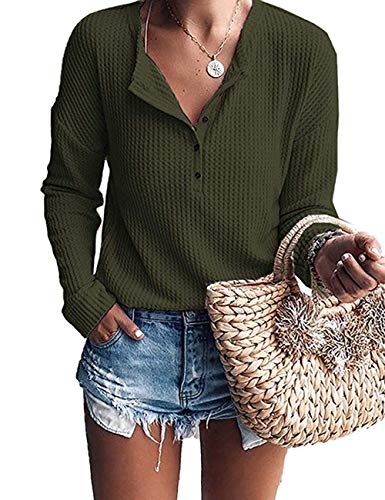 - Features: Long sleeves, Button up, V Neck,Button down henley shirts for women,v neck t shirts women, loose fit,waffle knit material, plain color,loose fitting pullover top.