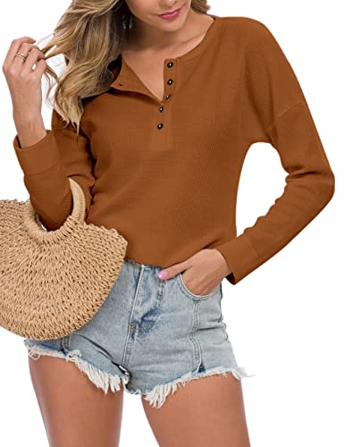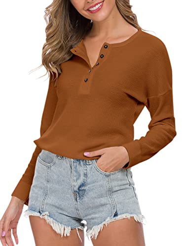 WNEEDU Women's Waffle Knit Tunic Tops Loose Long Sleeve Button Up V Neck Henley Shirts (M, Caramel)