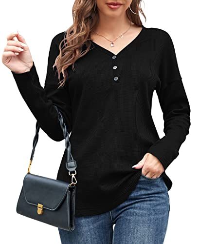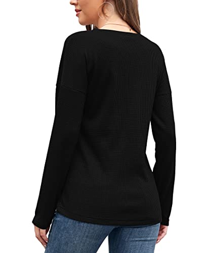WNEEDU Women's Waffle Knit Tunic Tops Loose Long Sleeve Button Up V Neck Henley Shirts (Y Black,M)
