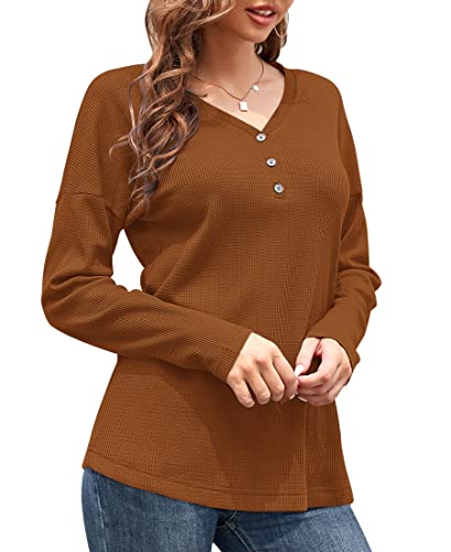 WNEEDU Women's Waffle Knit Tunic Tops Loose Long Sleeve Button Up V Neck Henley Shirts (Y Caramel,M)