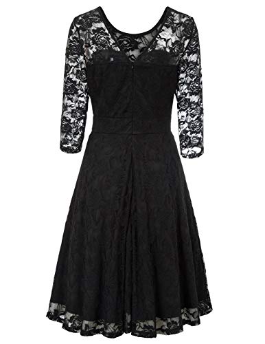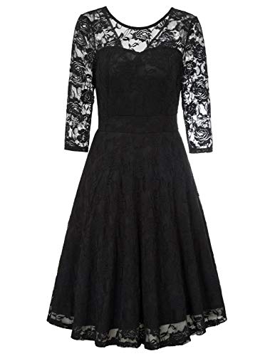 HUGS YOUR CURVES FITS PERFECTLY : Fit and flare shape is good to hide the tummy and flatter the waist. See through neckline and bottom, make your skin under the floral lace partly hidden and partly visible. 3/4 lace sleeve is stretchy, which can hide your big arms, vintage swing design and slim waist show your body curves, show out your feminine and elegant temperature.