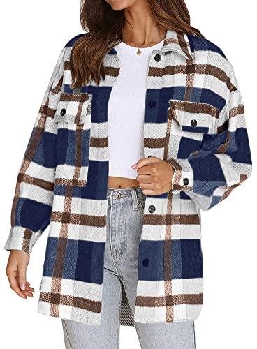 Women's Flannel Plaid Shirts Long Sleeve Button Down Chest Pocketed Shirt Blouses Tops Shacket 6017 Navy Blue Small
