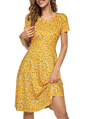 Yellow Floral 100 Spring/Summer Casual Women Short Sleeve Round Neck A Line Fit and Flare Midi Skater Dress - HUHOT